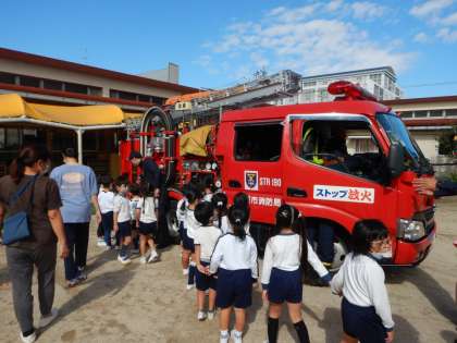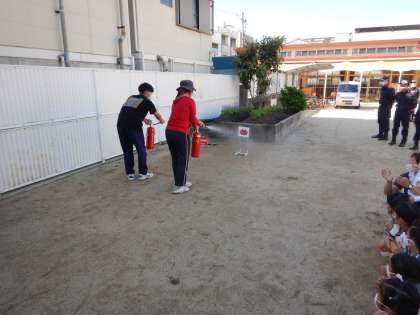 大阪消防振興協会から消防訓練指導にお越しいただき、園児へのお話や、通報訓練、水消火器を使っての消火訓練を実施しました。