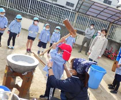 子どもたちは、杵の重さにびっくりしながらも、力いっぱいつくことができました。
