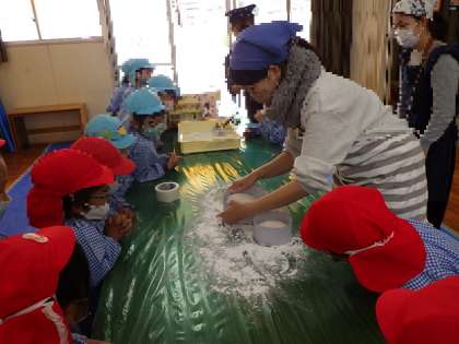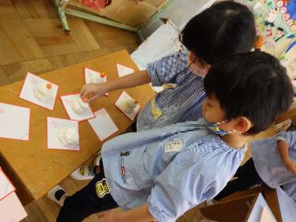 つきたてのおもちの温かさや柔らかさなどを感じながら、自分たちの鏡餅をつくりました。