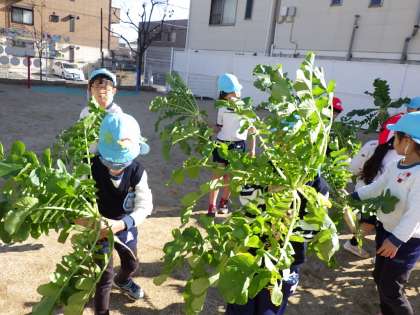 みんなで育てて収穫した大根。おうちに持って帰って、どんな料理になるのかな?