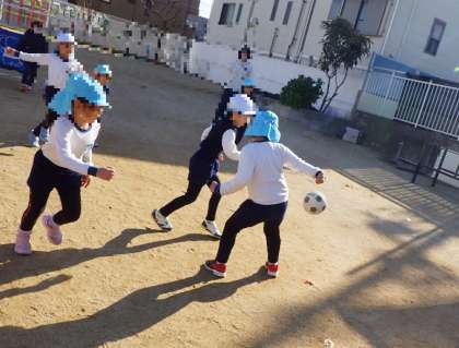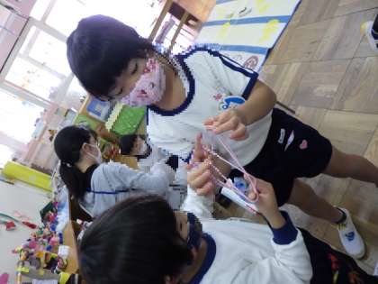 おうちの方の前で、日頃楽しんでいる遊び、得意技を披露する「ミニ発表会」があり、コマ回しやあやとり、けん玉遊びを見てもらうことができました。興味をもった遊びに一生懸命取り組む姿、たとえうまくいかなくても諦めずに何度も繰り返し挑戦する姿を見てもらうことができました。その後は、そら組で毎日楽しんでいるサッカーごっこをおうちの方と一緒にできて、子どもたちは大喜びでした。