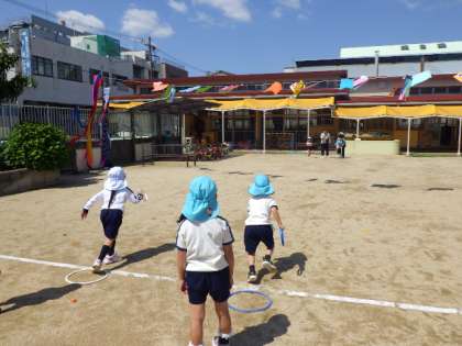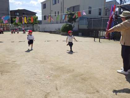 今日は、こどもの日の集いをしました。子どもたちがつくったこいのぼりが園庭にいっぱいに泳いでいて、とても賑やかな雰囲気になりました。子どもたちは、こいのぼりが泳ぐ中、折り返しリレーをしたり、かけっこをしたり、体操をしたりして体を動かす遊びを存分に楽しみました。