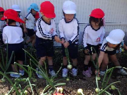 つどいの後には、畑で育てたタマネギの収穫をしました。ペアで一緒にどのタマネギにしようか選んで、「せ〜の!」でタマネギを抜いて大喜び!タマネギのいい匂いが園庭に漂っていました。