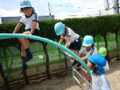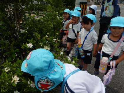 加美北幼稚園から加美第一保育所まで歩いていく時では、「良いにおいがするねん」と友達が教えてくれたクチナシの花をみんなで嗅いだり、地域のお店屋さんや景色などを見たりして、地域に親しむことができました。