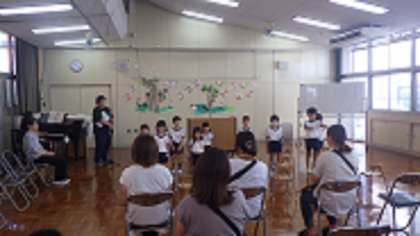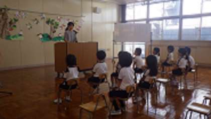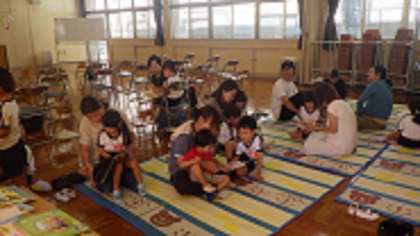 始業式では、園長先生の話を聞き、園歌を元気に保護者の前で歌いました。その後、親子絵本読み聞かせをしました。たくさんの絵本の中から読みたい本を選び、保護者の膝の上で読んでもらったり、友達と一緒に読んだりと楽しく参加していました。