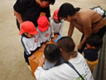 ばら組さんは、小さいお友達に「一緒に遊ぼう」と声をかけ、砂場で一緒に遊びました。そら組さんは、けいさつ鬼をするときに「○○ちゃんも一緒においで」「小さいお友達がいるときは、やさしく走ろう」と声をかけ、小さいお友達を気遣っている様子が見られました。さすが、お姉さんお兄さんですね♪