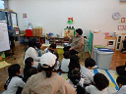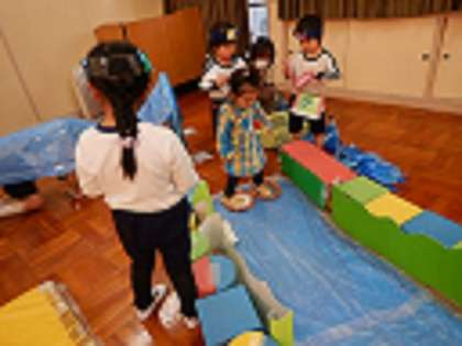 小さいお友達が幼稚園に遊びに来てくれて、一緒に忍者屋敷ごっこやお店屋さんごっこをしました。小さいお友達に遊びかたを教えてあげたり、こっちにおいでと手招きして遊びに誘っている様子が見られました。ごっこ遊びの後は、やきいもグーチーパーのじゃんけんと『どうぞのいす』の読み聞かせを聞きました。