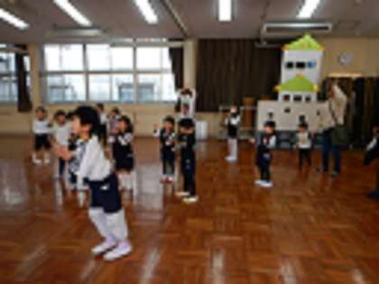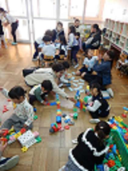 今日は一緒に遊ぼうがありました。子どもたちは小さい友達を玄関で迎えたり、受付で手作りの名札を渡して、お部屋まで案内していました。お部屋ではそら組、ばら組、未就園児のみんなで一緒に遊んで楽しい時間を過ごすことができました。