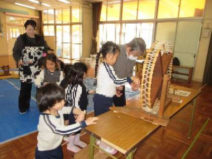 西野さんに、わたから糸にするまでの工程をわかりやすく丁寧に教えていただき、「やってみたい!」と早速自分たちで挑戦!!できあがった糸をブレスレットのように腕に巻いてもらうと「先生!こんなんしてもらった!」と嬉しそうに見せ、「もう一回したい!」と繰り返し遊んでいました。。