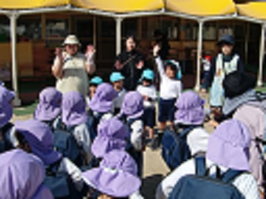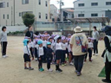 園庭でドッチボールをしたり、運動遊具で遊んだりして楽しみました。その後、保育園の友達が運動会をしたパラバルーンを見せてくれました。保育園の友達の頑張りにとっても感動しました。お別れの時は、お別れがなごり惜しくて、いつまでも手を振っていました。