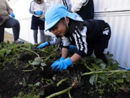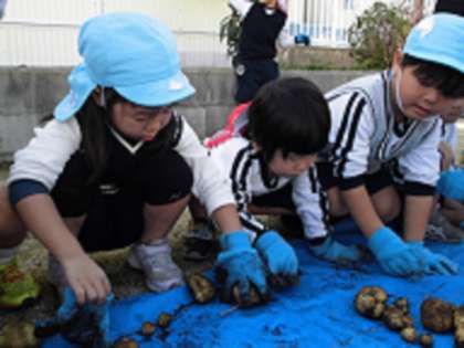 今日は、園庭の畑でジャガイモ掘りをしました。実は、当初その畑には夏の初めにサツマイモを植えていたのですが、猛暑でサツマイモが全滅してしまい、急遽9月に秋ジャガイモを植えて、大事に育ててきました。春にも地域の方のジャガイモ掘りを経験していた子どもたちですので、掘るのが上手で、どんどん土の中に眠っていたジャガイモを掘り当てていました。掘った後に、みんなで掘れたジャガイモを並べて数えると、なんと大小合わせて150個!とっても楽しいジャガイモ掘りを経験できました。