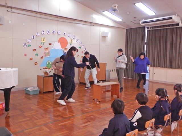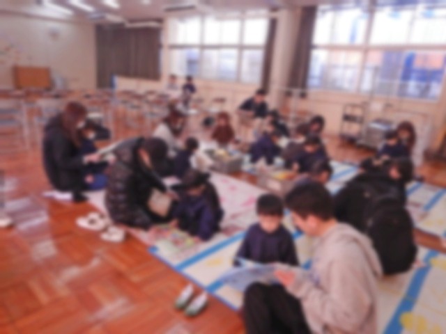 始業式では鏡餅の由来を聞いたり、みんなで歌を歌ったり、先生方がお正月の遊びを披露したりと和やかに進んでいきました。始業式の後は親子絵本読み聞かせでお家の方に絵本を読んでもらい、ほのぼのとした時間を過ごしました。