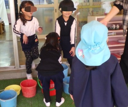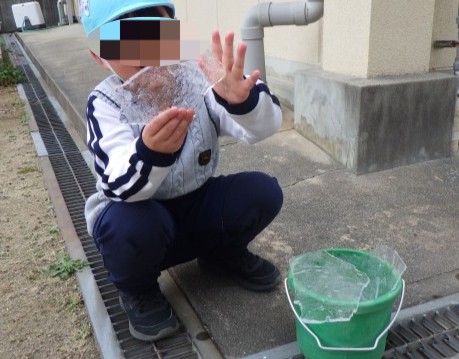 園庭で遊んでいると、プールに氷が張っているのを発見!さっそくみんなで氷を集めて外で遊んでいなかったクラスの友達にお知らせしました。