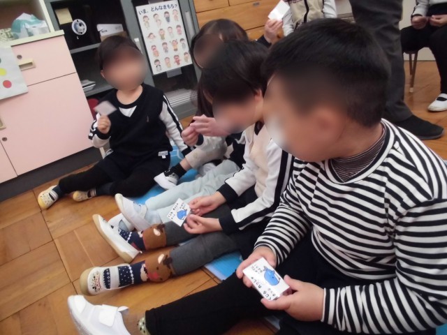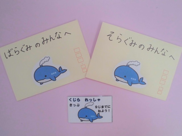 最後に、幼稚園に届いたくじら列車の切符を子どもたちに渡しました。