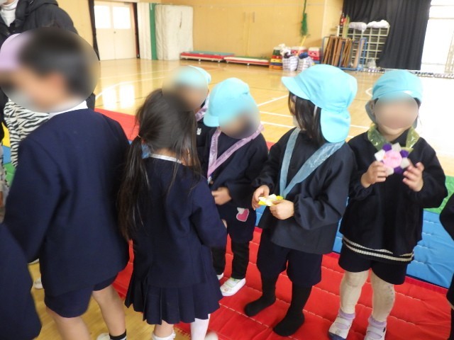1年生のお兄さんお姉さんが合奏を披露してくれたり、スイミーのお話の音楽劇を聴かせてくれたりと「すごいね~!」「長い歌も覚えていたね~」と驚きがいっぱいでした。その後は、学校マルバツクイズをしたり、じゃんけん列車をしたりしてみんなで楽しみました。「学校の勉強は楽しいよ」と教えてもらい、小学校への期待が高まりました。