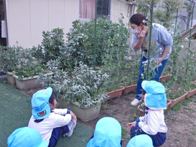 「かわいそう」とパンジーの上に置いてあげ、「蜜飲むかな」と園長先生と一緒にやさしく見守っていました。