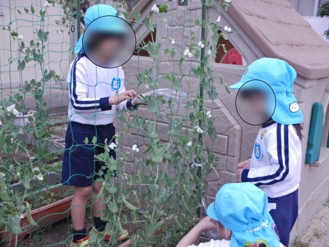 パンジーの横の畑には、スナップエンドウがたくさんなっています。