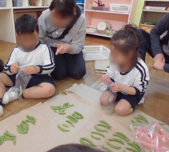 スナップエンドウの最後の収穫をしました。全員で持ち帰るために、そら組(年長児)が「8個ずつ」分けることになりました。一生懸命に「1、2、3、、」と声に出しながら数える姿がとても可愛かったです。こうして園生活の中で少しずつ数に関心がもてるような保育も進めています。幼稚園での収穫経験から「初めてスナップエンドウを食べれた」と保護者の方から嬉しいお知らせも頂きました。今日もお家でおいしく食べてね。