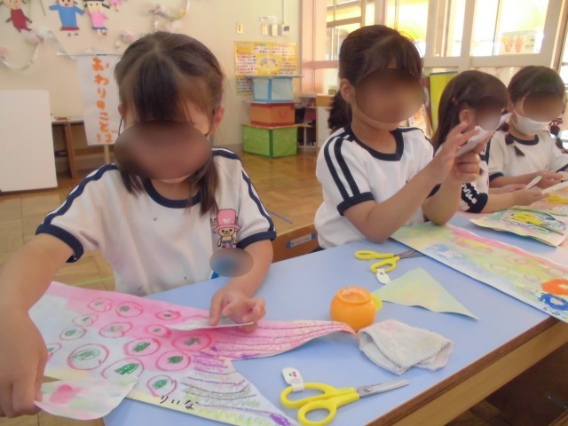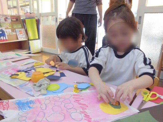 そら組(年長児)はこいのぼり作りをしました。「本物のこいのぼりみたいにしたい」と、何枚も丸を切って重ねて貼って目をつくったり、ひれを切ったりしていました。根気よく取り組む姿に成長を感じました。