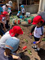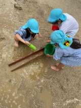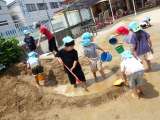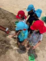 今日も園庭では、泥んこ遊びを楽しむ子どもたちの姿が見られました。バケツで水を流し...