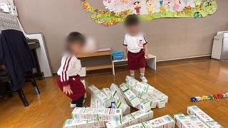 牛乳パックを積んだり、並べたりして遊んでいた桃組さん。