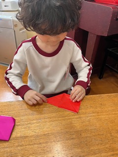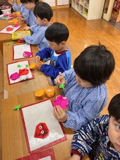 折り紙でイチゴづくり☆(赤組・4歳児)