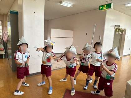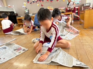 その後は、「かっこいいベルトもつくる!」とつくったり、こいのぼりの棒(新聞紙)の作り方を思い出して剣をつくったりと活動の経験を生かした遊びを楽しんでいました!
