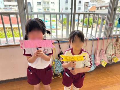 また、友達同士で作り方を考え、教え合いながら手持ちサイズのこいのぼりをつくり「先生、こいのぼりとお散歩行ってきまーす!」と廊下へ...!