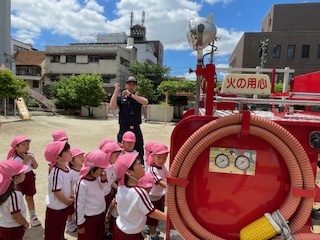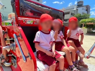 避難訓練の時も園庭に停まっていた消防車が気になっていた子どもたち。