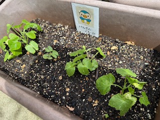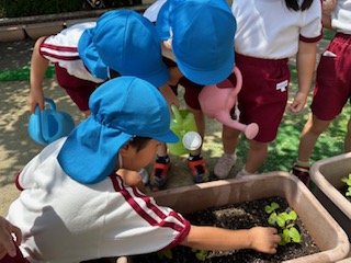 青組の子どもたちが大切に育てているアサガオ!花が咲く日を楽しみに毎日水やりも頑張っています!「あれ?葉っぱの形が変わってる!!」と双葉と本葉の形の違いに気づいた子どもたち!周りの子どもたちも「どれどれ〜?どの葉っぱのこと〜?」と1人の子どもの気づきがクラス全体へと広がっていきました。また、夏野菜のミニトマトの花も咲き始め「黄色の花が咲いてる〜!」「めっちゃ大きくなってきてる!」「こうやってピーマン大きくなるんや〜!」と友達同士で話す姿も見られました!友達同士で気づいたことを伝え合うことがたくさん増えた青組の子どもたちです!(『知』『徳』の育ち)