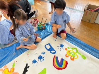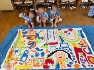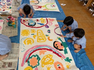 幼稚園だからこそ経験できる活動や友達と一緒に大きな紙にのびのびと絵筆を使ってかく楽しさをたくさん感じていたように思います!どのグループも思いが詰まったとても心温まる素敵な絵になりました!