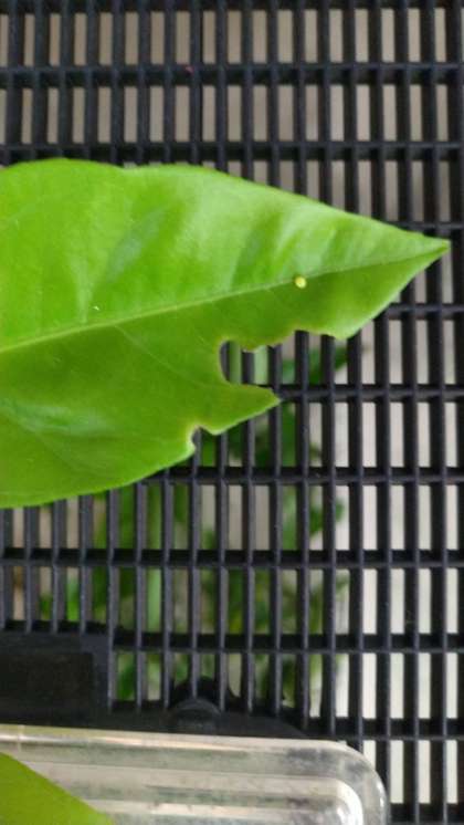 4月の終わり頃、園庭のミカンの木に小さな小さなチョウチョの卵を発見しました。