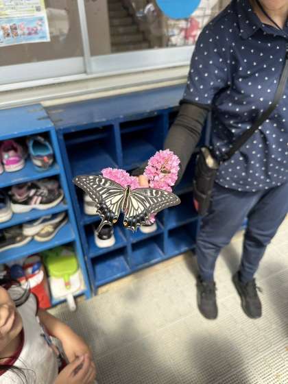 自然の中に返す日が来たことを子どもたちに知らせてお別れしました。チョウチョに「元気でね」と手を振る子どもたちの姿がありました。(『徳』の育ち)