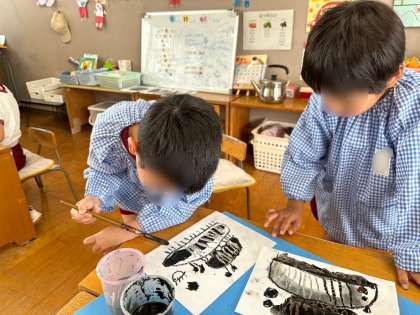 そのような姿からクラスで、パスと絵の具を使ってダンゴムシの絵をかいて遊びました!