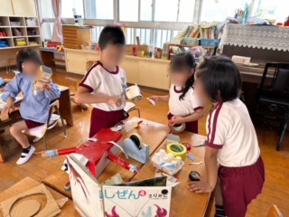 「爪が強そう!牛乳パック切って爪つくってみるわ!」「体は赤色やから赤色のテープで貼ってみる!」「足は何本かな...?1.2.3...」「この辺に爪つけたいねんな〜!私持っとくよ!」「口パクパク開いてご飯食べられるようにしたで!」と互いにアイデアを言葉で伝えながらイメージを膨らませながらつくることを楽しんでいました!