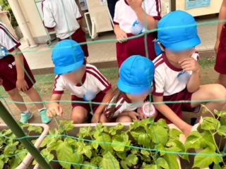 「どのグループのアサガオが高いか高さ比べしよう〜!」と手で高さを測りながら比べっこ!「始めは小さな種だったのに〜!」「水やり頑張ってるもんな!」と友達と生長の喜びを分かち合っていました!