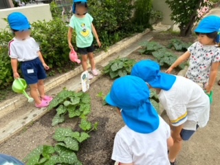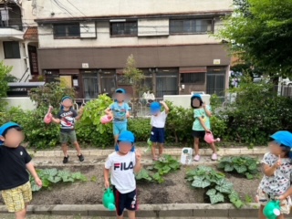 「コツマナンキンもアサガオみたいにツル伸びてきてる〜!」「葉っぱもまた大きくなってる気がする!」とお日様のパワーと子どもたちの水やりパワーでコツマナンキンも大きく生長中です!