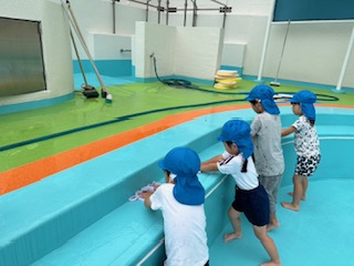 来週のプール開きに向けて、青組の子どもたちでプールや水遊び遊具の掃除を行いました!