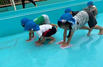 プール掃除前には「みんな集まって、ここに手を出して〜!」と1人の幼児の合図をきっかけに全員集合し「みんなでプールを綺麗にするぞー!えいえいおー!」と一致団結し気合いも十分にスタートしました!