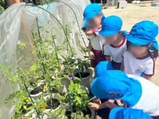 「このピーマン大きくなってきたから収穫できる!」「このトマトも赤色になったから収穫しよう!」と友達と一緒に見分けながら収穫しました!