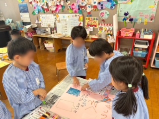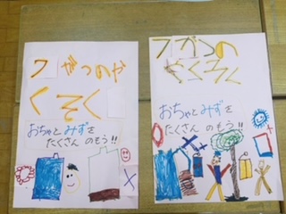 絵をかく子どもたちの会話を聞いていると、「飲み物をたくさん飲んで、体のお水が溜まっててにっこりの顔にした絵と、こっちは、お水を少ししか飲んでいなくて元気がない顔にしよう!」と聞いた話を思い出し、友達とアイデアを出し合いながら絵にかいて表現する姿が見られました!