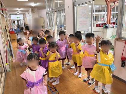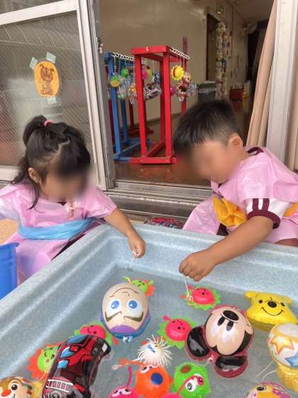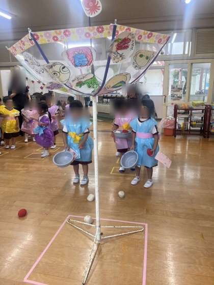 「縁日ごっこって何」と言っていた子どもたちも遊びはじめてみると「魚釣りしたい」「玉入れもう1回したいなぁ」と遊びに夢中になっていました。