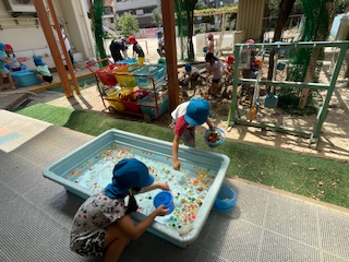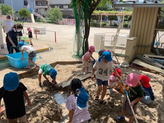 午前中は、3学年一緒に水遊びや泥遊びをしながら楽しんでいました。