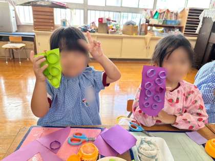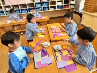 「私のは大きな粒も小さな粒もつくったよー!」「ぼくはブドウ3つつくった!」「マスカットとブドウどっちもつくる!」と製作が大好きな青組の子どもたちは友達との会話を楽しみながら美味しそうなブドウがたくさんできました!