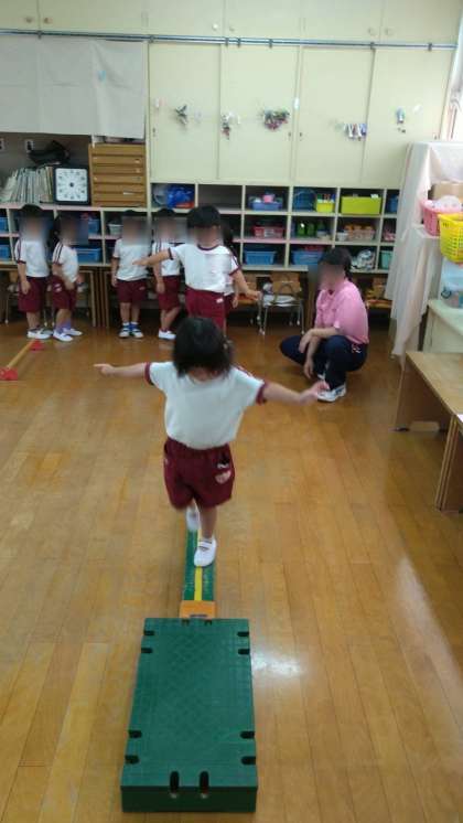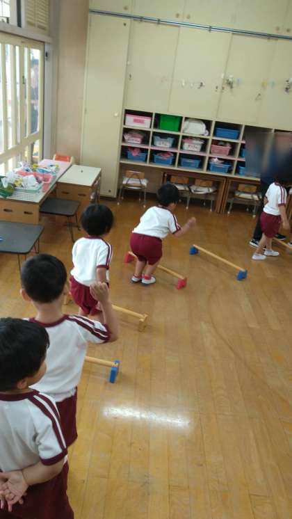 体を動かすことが大好きな子どもたちは、室内でもサーキット遊びを楽しんでいます。渡ったり、跳んだり、工夫したり、友達を真似てみたりして遊んでいます。