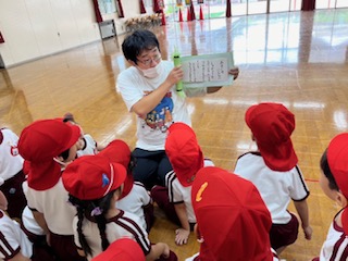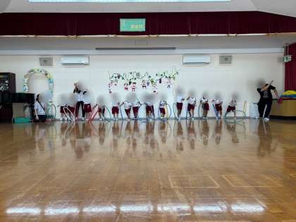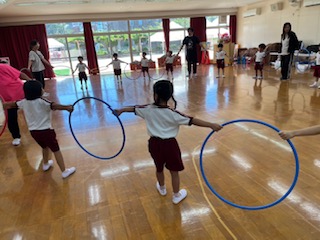 この日は、みんなで輪になった後、輪の真ん中に向かってフープを転がしてみることにしたようです。友達と息を合わせて、「いっせーのーで!」のかけ声で転がし、フープの転がる行方を追いながら楽しんでいました。友達と一緒だからこそ、遊びの楽しさがどんどん大きくなってきています!