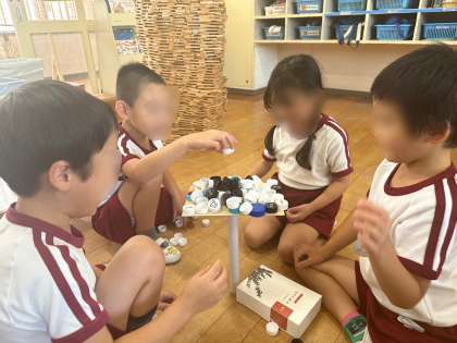 子どもたちの遊ぶ様子を見ていると自宅から持ってきた素材を活用し、芯の上に一枚の板を乗せ、その上にそれぞれ色分けされたキャップを順番に乗せながら遊んでいる姿が...!