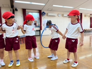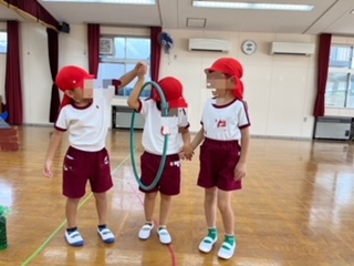 グループで手を繋ぎフラフープをくぐっていく技『くぐるの術』を各グループで競争し、少しずつくぐる時間が早まってきています!隣で友達のサポートをする姿や自分でくぐり方を工夫する姿も見られ名人になってきています!