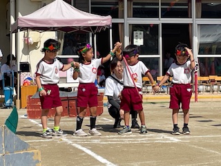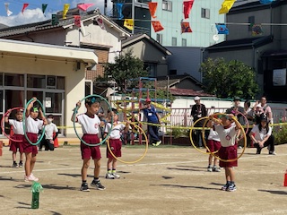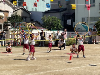 グループごとに挑戦するフープ通しの術は、手をつないだまま、一本のフープを通していきます!なかなか通らず、難しい術でしたが、友達と気持ちを合わせてできた時の最後の「ニン!!」の掛け声は力強さを感じました。