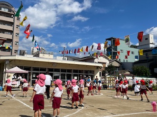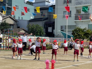 保護者の方に表情が見えるようにと、外向きで踊りました。外向きで踊ることは、子どもたちにとっては、友達の踊りが見えないので少し不安かな…とも思いましたが、保護者の方を見ながら踊ることで気持ちも高まっていた子どもたちでした!